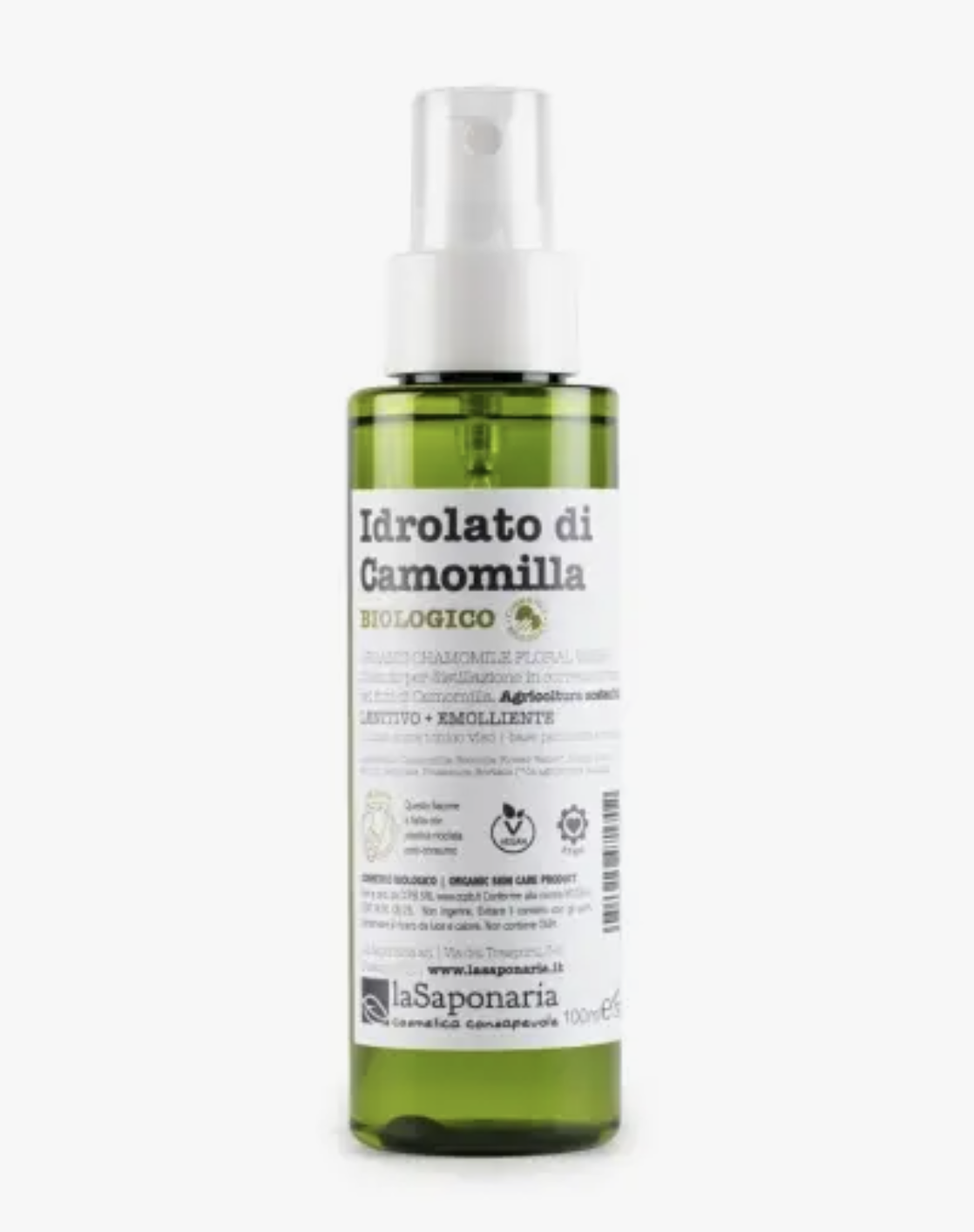 Ingredients: Chamomila Recutita flowers Water ( da agricultura biológica), Benzyl Álcool, Sodium Benzoato, Potassium sorbate.