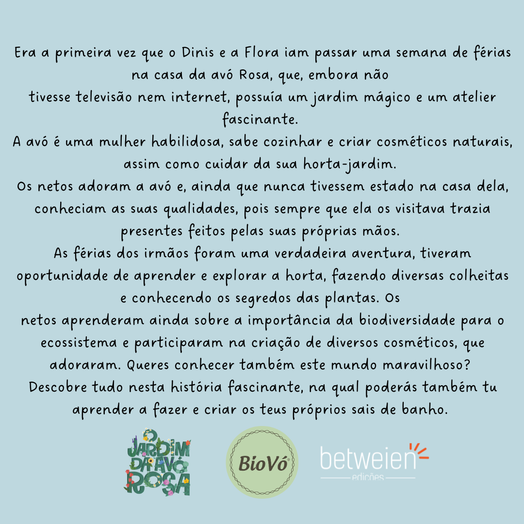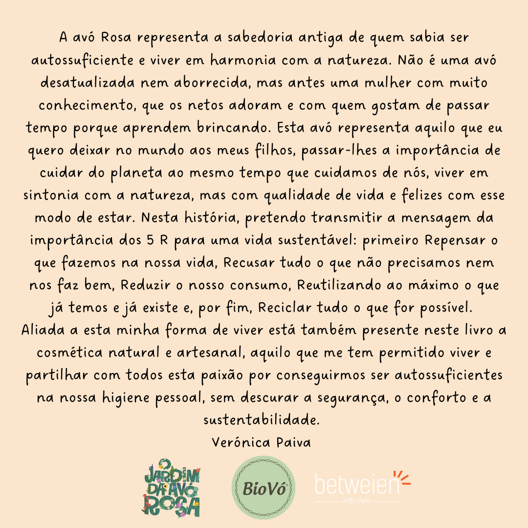 É um livro escrito a pensar nas crianças, de forma a incentivar a olhar para a natureza como algo belo e muito importante. Uma história escrita a pensar no amor pelas nossas avós onde a sustentabilidade fazia parte do seu dia-a-dia.
