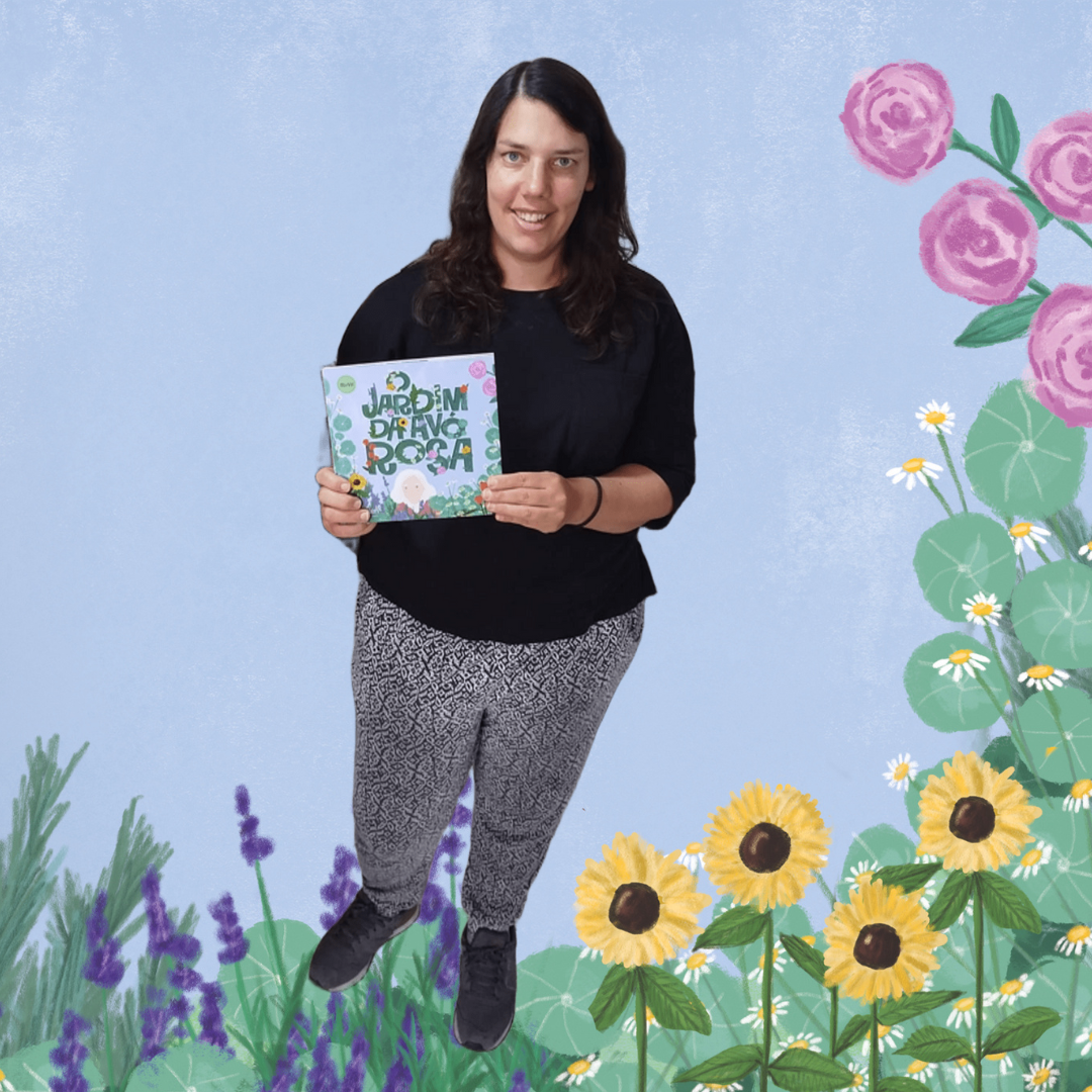 • Mulher segurando livro colorido Jardim de Vovó Rocha sobre fundo azul com ilustrações de flores