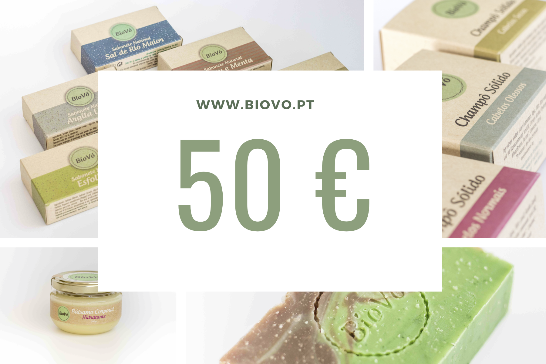 • Produtos de sabonete, creme e caixa Biovo para cuidados pessoais.